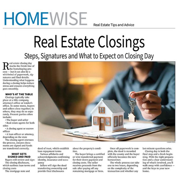 Our HomeWise page is the perfect companion to your daily or weekly real estate section. Available in tab and broadsheet sizes, this page covers real estate basics with a different topic each week devoted to practical financial considerations, buying and selling, and home improvement. The broadsheet page includes space for advertising at the bottom, a great place for a local agent to see his or her name and face, as well as a glossary of real estate terms.
